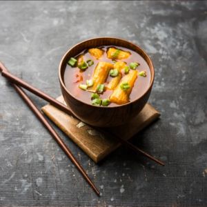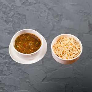 A spicy and flavorful Indo-Chinese soup made with mixed vegetables, topped with crispy noodles for the perfect crunch.