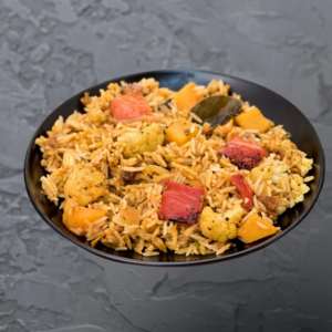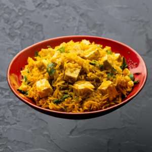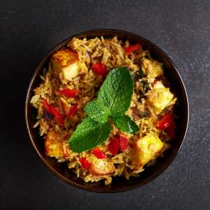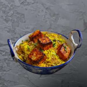 Soft paneer cubes infused with rich spices, nestled in fragrant basmati rice for a masaledar delight.