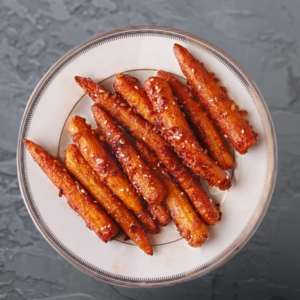 Baby corn tossed in a crispy batter and coated with spicy chili sauce.
