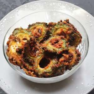 Fried bitter gourd prepared with garlic and spicy curry masala, balancing bitter and bold flavors beautifully.