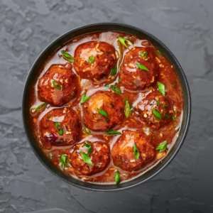 Golden-fried vegetable balls simmered in a rich, flavorful Manchurian sauce, blending crunch with savory delight.
