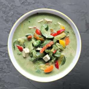 A creamy balanced curry with fresh vegetables in a fragrant green curry sauce.