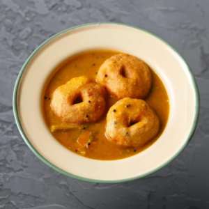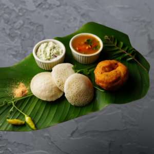 Steamed idlis and crisp vadas drenched in flavorful vada curry, offering a warm and authentic taste of Tamil Nadu.