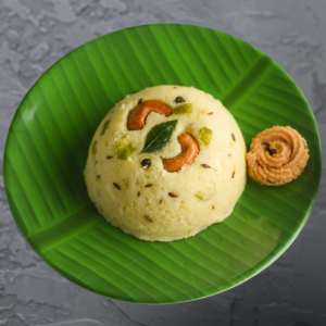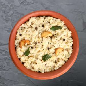 A comforting South Indian dish made with rice and moong dal, flavored with ghee, pepper, and cashews.