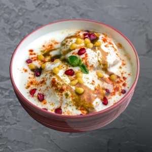 Soft lentil dumplings soaked in creamy yogurt, garnished with spices and tangy chutneys.