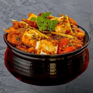 Paneer cubes sautéed with bell peppers, onions, and traditional Indian spices in a thick tomato-based gravy.