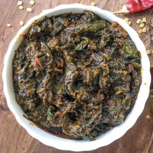 Potatoes simmered in a spiced spinach curry, combining earthy flavors with the warmth of Indian spices.